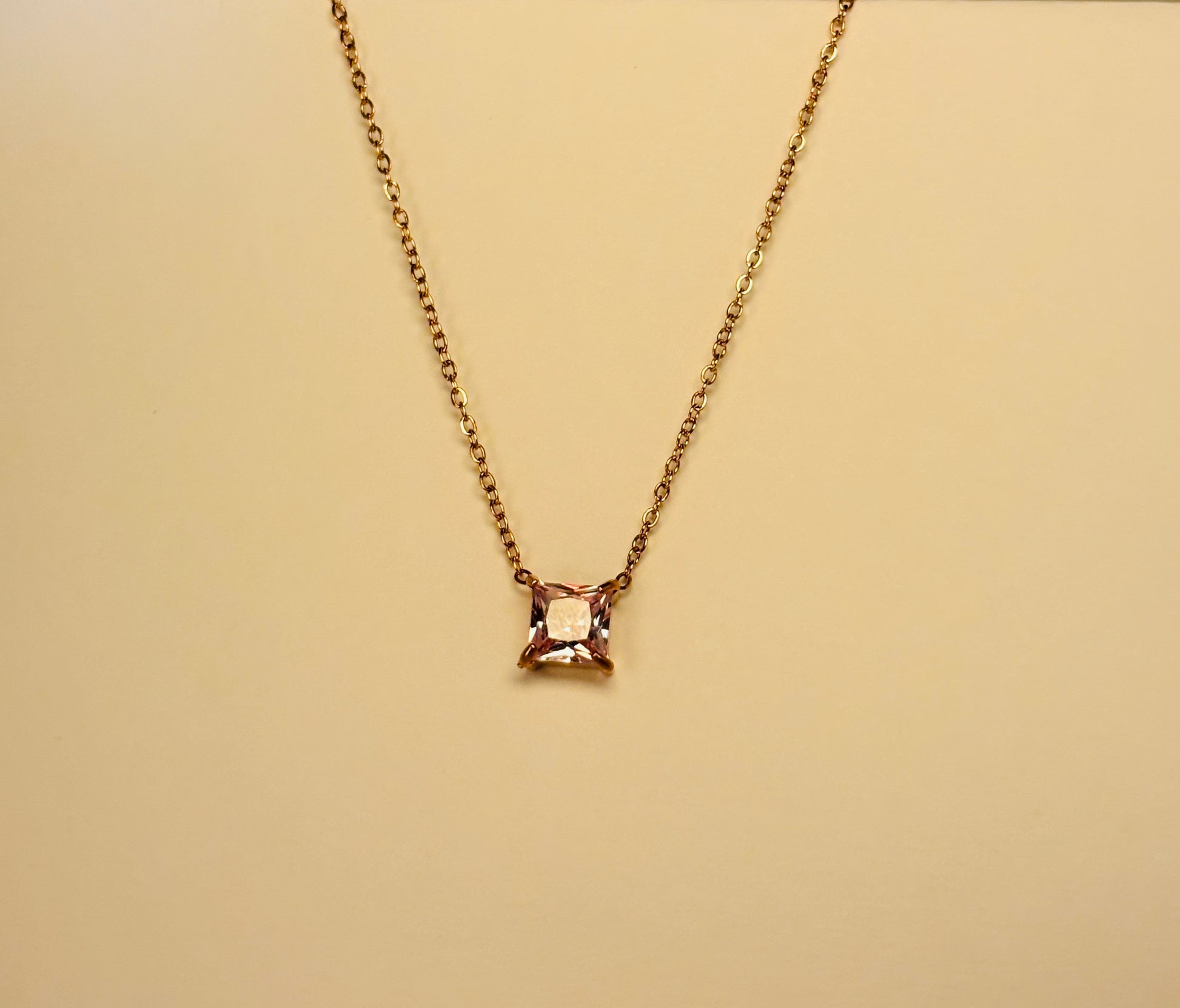 A delicate 18K gold-plated necklace featuring a sparkling princess-cut solitaire – perfect for everyday elegance or a subtle festive touch.